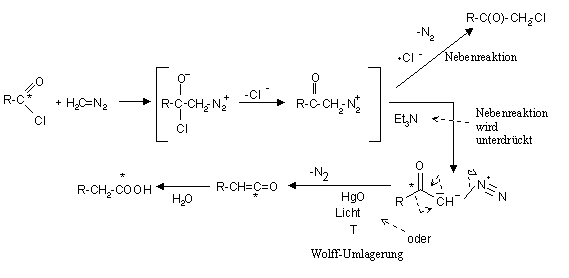Dabei kommt es zu einer Acylierung am C-Atom. Intermediär entsteht ein Diazoniumbetain, das sofort Chlorwasserstoff abspaltet und ein mesomeres Diazoketon bildet. Die Reaktion folgt einem Additions-Eleminierungs-Mechanismus. Das Diazoketon spaltet bei höheren Temperaturen, in Gegenwart von Metallkatalysatoren, Stickstoff ab. Dabei wird eine Elektronenmangelverbindung gebildet, ein Carben. Durch eine Wolff-Umlagerung stabilisiert sich das Carben unter Ausbildung einer Doppelbindung zu einem Keten.