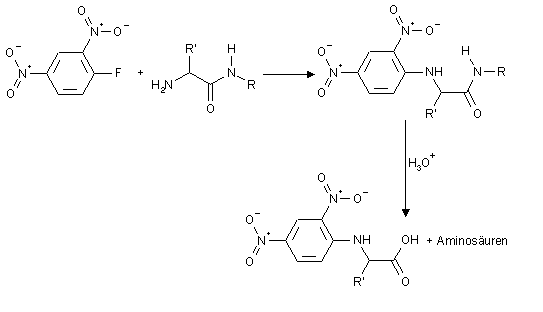 Zuerst wird (über eine nucleophile aromatische Substitution) 1-Fluor-2,4-dinitrobenzol an die Aminogruppe substituiert. Dann wird das Peptid hydrolytisch gespalten. Führt man die Hydrolyse vorsichtig genug durch (was allerdings lästig ist) kann man so das ganze Peptid abbauen. Bei der Spaltung bleibt der Dinitrophenyl-Rest an der N-terminalen Aminogruppe haften.Diese kann dann leicht abgetrennt und z.B. über Chromatographie bestimmt werden.
