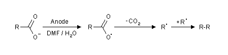 Bei der Reaktion wird CO2 abgespalten. Die Alkylradikale dimerisieren zu symmetrischen Verbindungen.