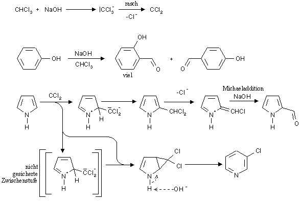 "Vilsmaier-Haack-Reaktion im alkalischen. Das Problem ist, daß zum Teil Nebenreaktionenablaufen.