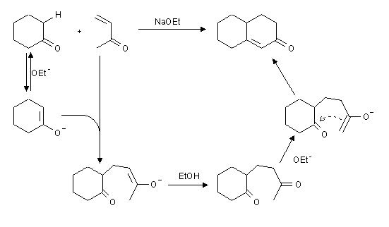 Die Reaktion spielt(e ?) eine große Rolle bei der Synthese von Steroiden. Bei der Reaktion handelt es sich mal wieder um eine Michael-Addition